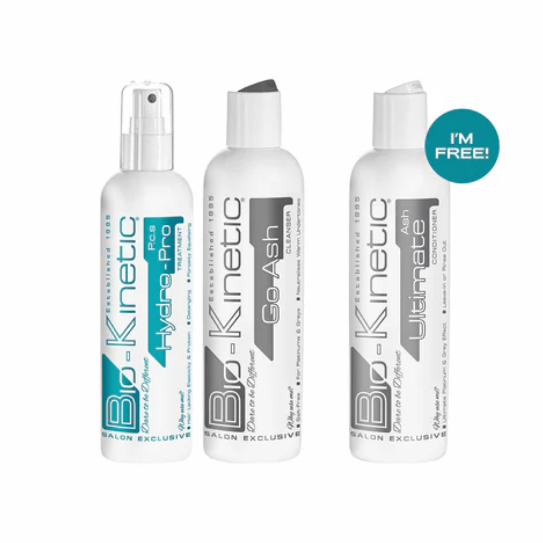 Elevate your haircare routine with the Bio-Kinetic Ash Ultimate Bundle, designed to unlock your hair's true potential and achieve stunning ash tones. Start with the toning shampoo that effectively cleanses while neutralizing unwanted gold and copper undertones, ensuring long-lasting color vibrancy. Complement this with a free conditioner specifically formulated to maintain and enhance ash shades, leaving your hair soft, manageable, and beautifully nourished. Finish with the Hydro Pro treatment, which protects against heat and environmental damage, making detangling effortless and controlling split ends. This ultimate bundle is your complete solution for vibrant, healthy ash-toned hair!