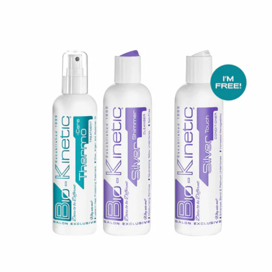 Introducing the Bio-Kinetic Silver Care Bundle, expertly crafted to maintain and enhance your blonde and silver-grey hair. This bundle features the Bio-Kinetic Silver Shimmer Cleanse, a dual-action shampoo that cleanses while neutralizing unwanted yellow undertones, resulting in a more natural blonde. Complementing this is the FREE Bio-Kinetic Silvertouch Conditioner, designed to enrich moisture and suppress yellow tones, ensuring vibrant, cool-toned hair that feels soft and manageable. To protect your locks from heat damage, the bundle also includes Bio-Kinetic Thermo Care, a leave-in treatment that shields your hair from high temperatures while reducing mechanical stress. Elevate your haircare routine with the Silver Care Bundle for radiant, healthy-looking hair.