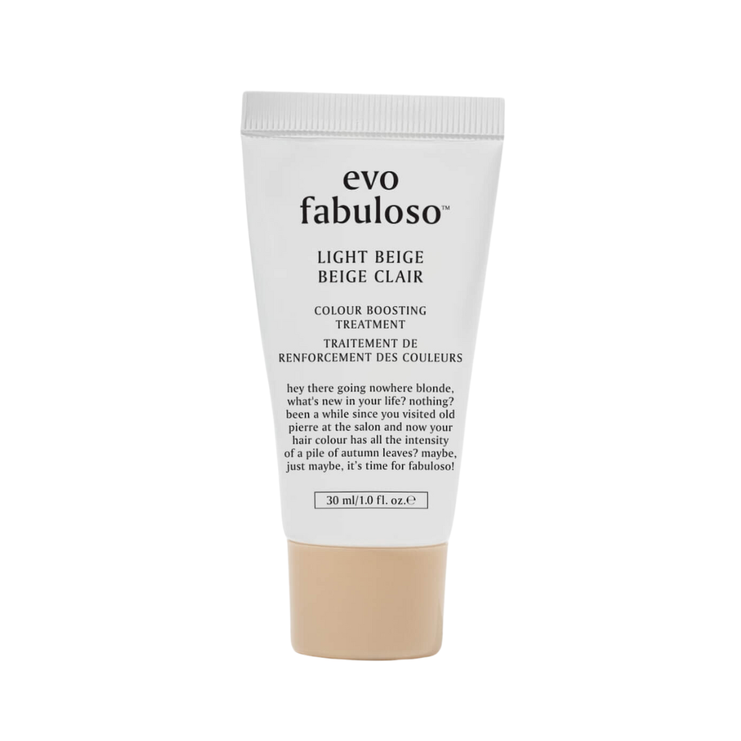 evo fabuloso colour boosting treatments instantly refresh, tone, revive and add shine to color treated hair. this at-home, 3 minute conditioning treatment uses cationic hair dye to help boost color and keep hair vibrant for longer. this hair treatment features reparative and anti-static properties to help strengthen hair and reduce frizz. light beige is best suited to dull, dry, color-treated light blonde to blonde hair. take evo fabuloso straight from shelf to shower to keep color-treated hair toned, vibrant and healthy in-between salon visits.