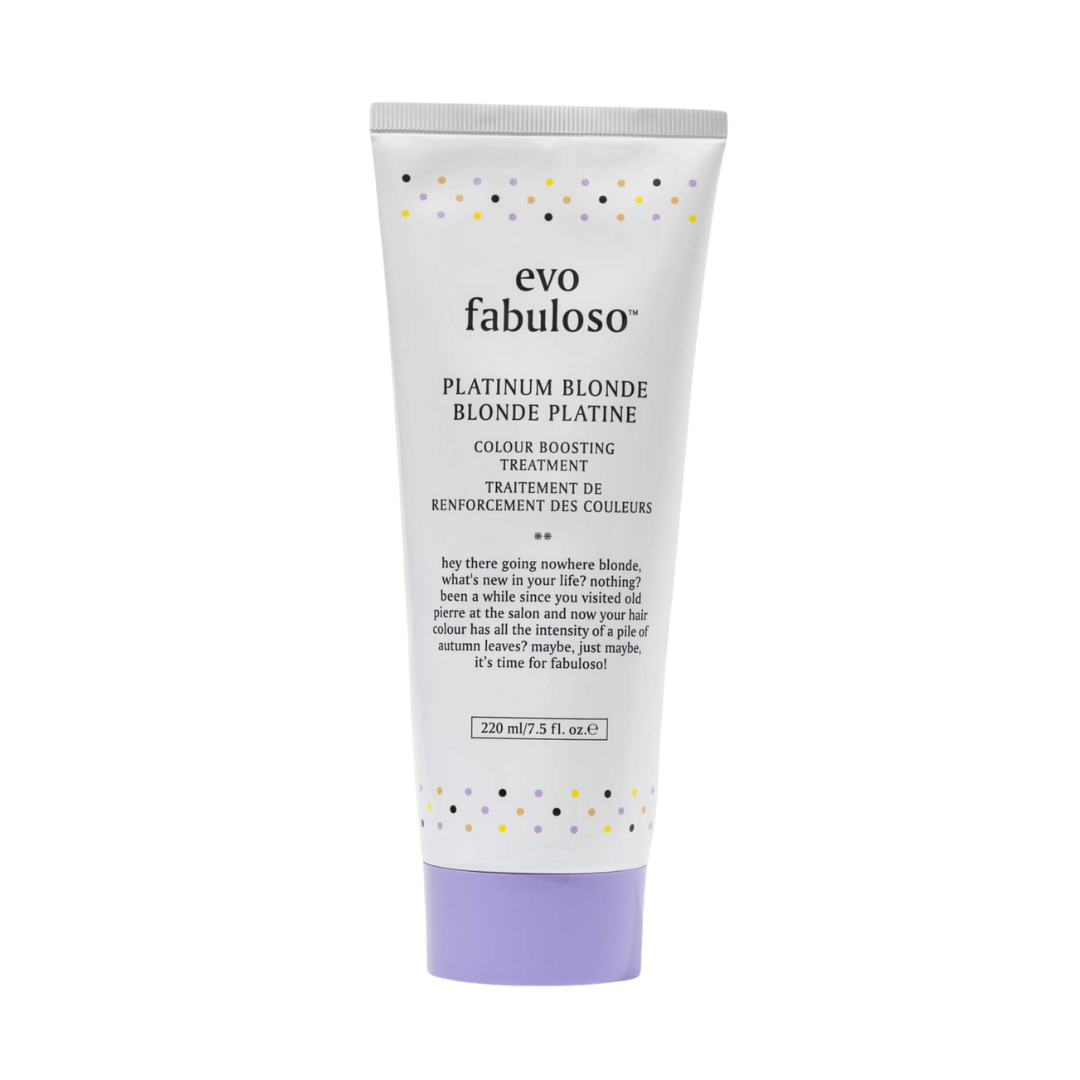 evo fabuloso colour boosting treatments instantly refresh, tone, revive and add shine to color treated hair. this at-home, 3 minute conditioning treatment uses cationic hair dye to help boost color and keep hair vibrant for longer. this hair treatment features reparative properties to help strengthen hair and reduce frizz. platinum blonde is best suited to blonde, lightened or gray hair. the evo fabuloso platinum blonde trio is here to tone brass, repair damage and bring out the best of your blonde.