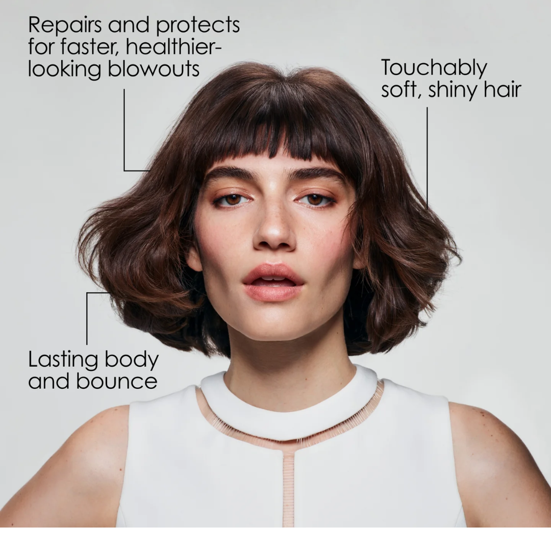 It is a reparative blow-dry mist for lasting body and bounce that protects hair for soft, shiny, and visibly healthy hair.