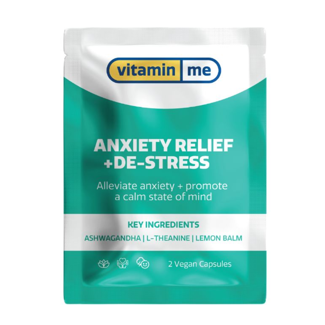 Find your inner calm with VitaminMe's Anxiety Relief + De-stress formula. Combining Ashwagandha, L-Theanine, and Lemon Balm, it promotes relaxation and a tranquil mental state while reducing stress and anxiety. Take control of your peace of mind with VitaminMe.